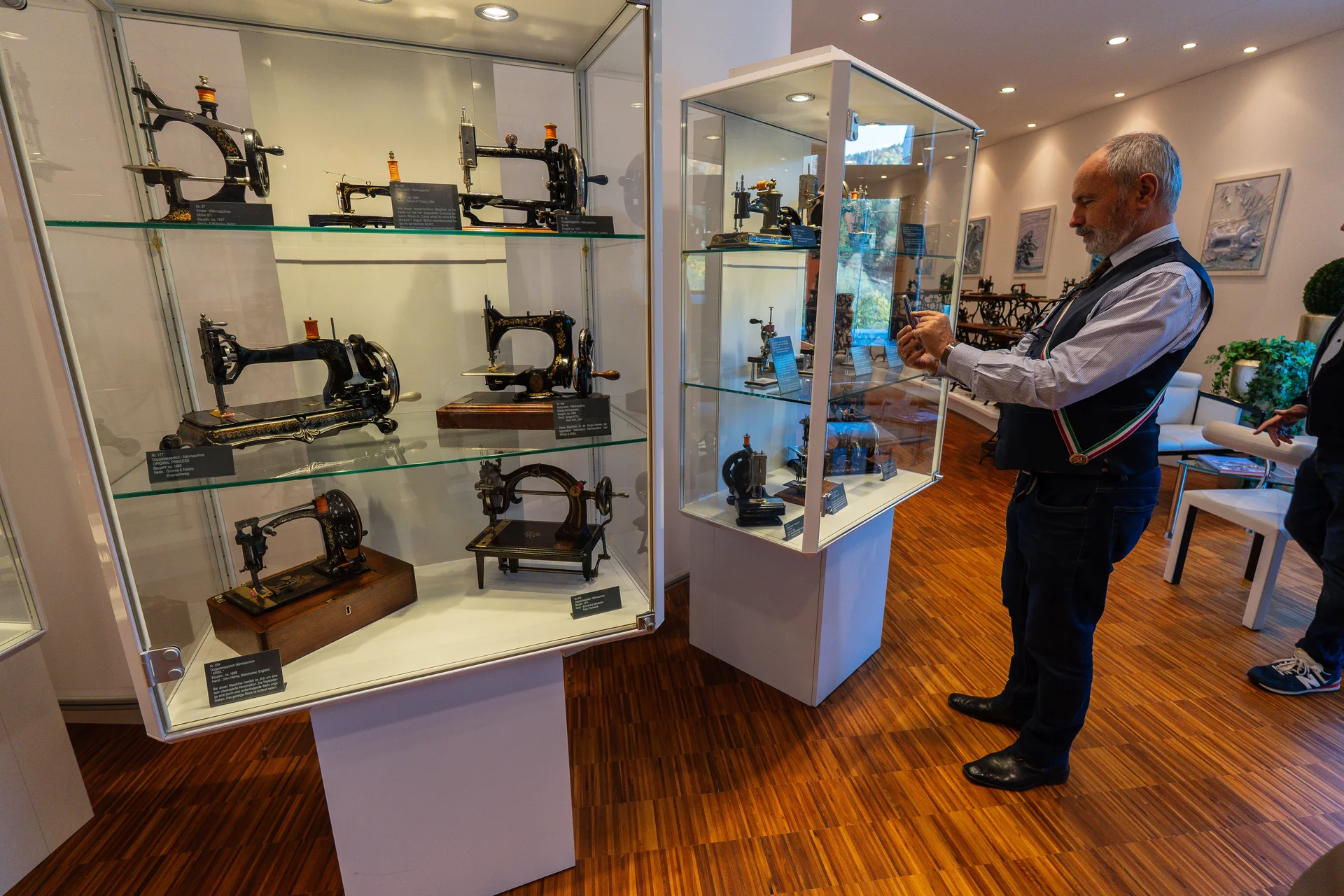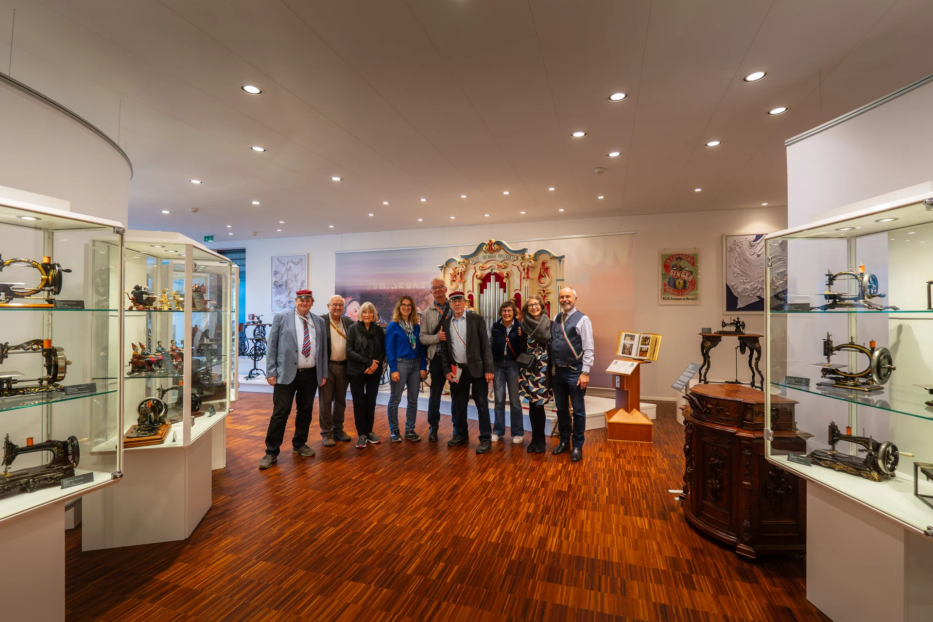 Wer geglaubt hatte, es ginge in dem Museum primär um technische Dinge wie Gerad-, Zickzack-, Overlock- oder Kettenstich, sah sich getäuscht. Themen waren vielmehr Tisch- vs. Gestellnähmaschinen oder Haushalts- vs. Kindernähmaschinen. Verblüffend war vor allem, mit viel Liebe zum Detail die Maschinen selber und auch ihre Gestelle gestaltet waren. Ein Aufwand, der heute undenkbar wäre. Am kuriosesten war eine Löwenfigur, bei der man Kopf, Vorderpfoten und Hinterteil wegschwenken konnte, und schon saß man vor einer voll funktionsfähigen Nähmaschine.